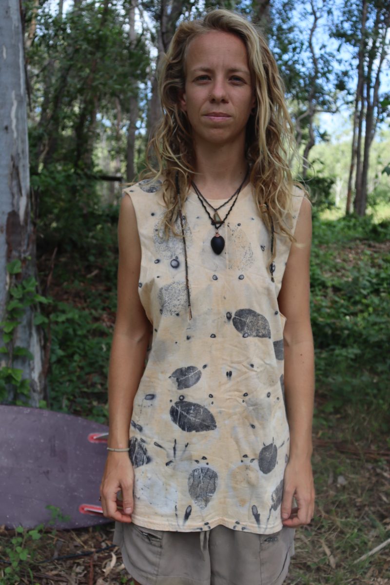 Upcycled shirt adjusted into tank. Mens size small. Naturally eco printed with Cadagi leaves from Agnes Water, QLD. Can be washed in the washing machine, the dye will not run. For print to last longer natural detergents are preferred and if possible hand wash.